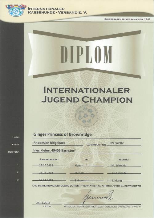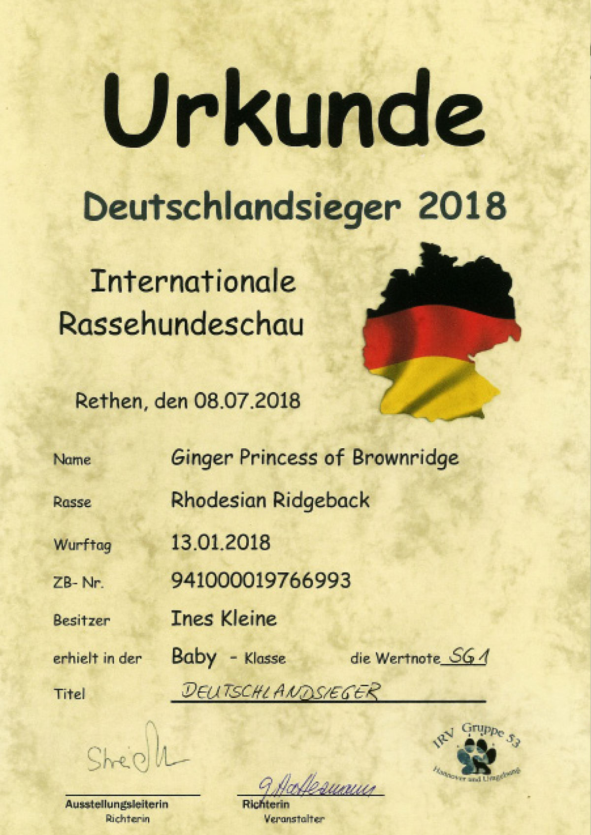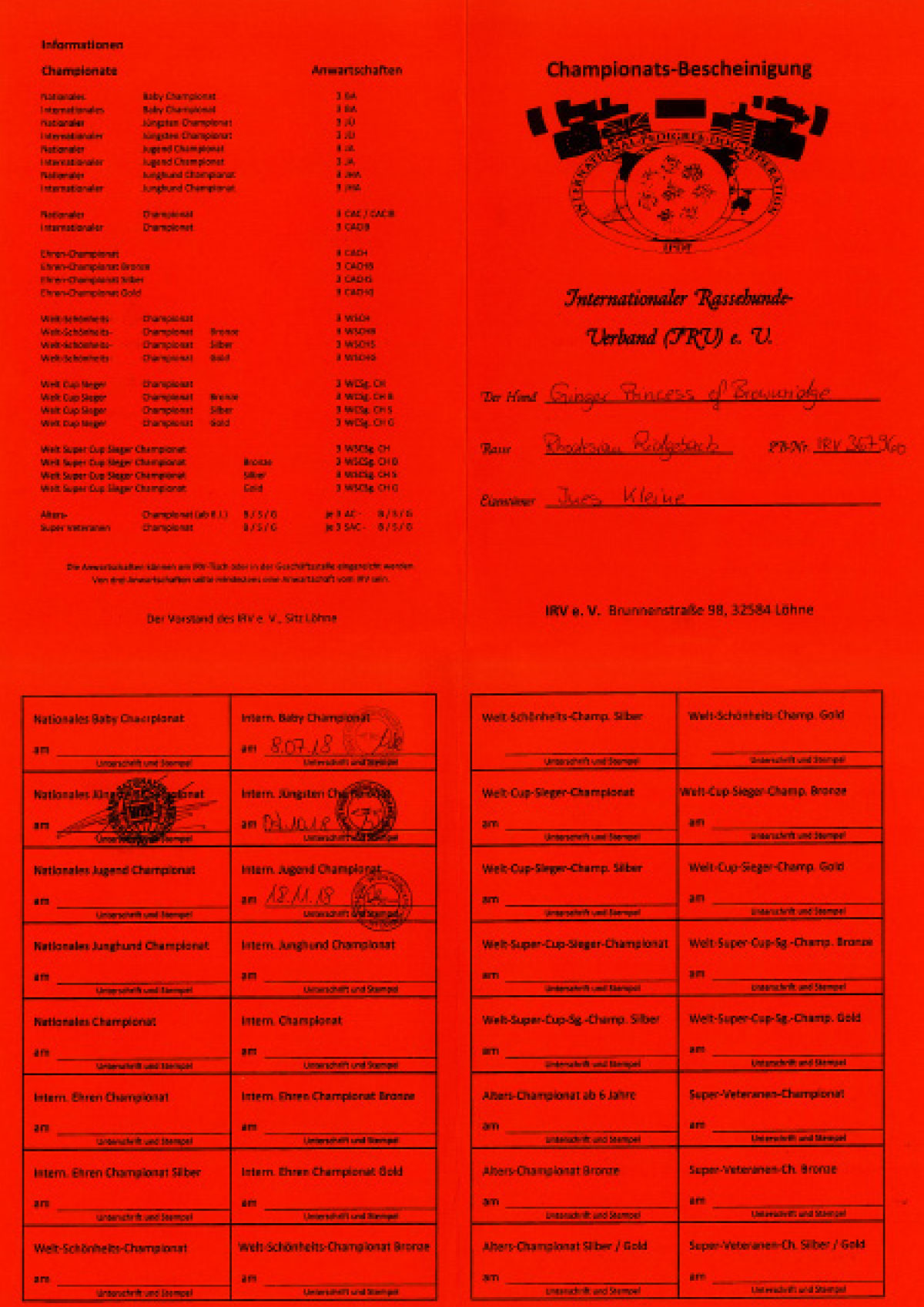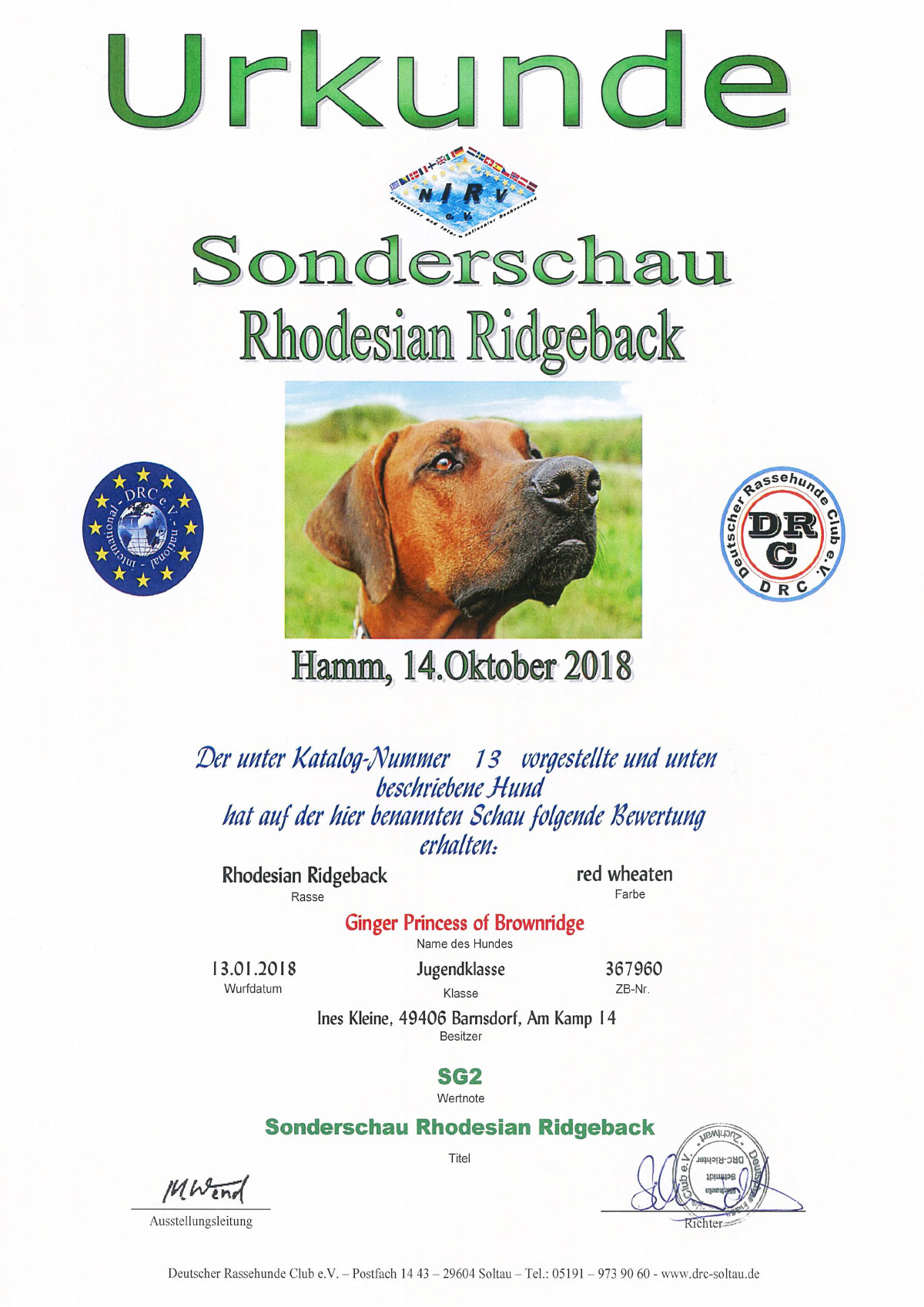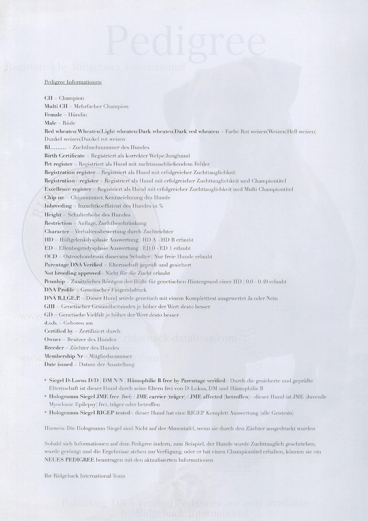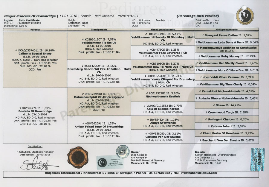 Ginger ist umfangreich genetisch und röntgenologisch getestet. In der Internationalen Gesundheits Datenbank bei Ridgeback International sind weltweit über 70.000 Rhodesian Ridgebacks mit ihren Gesundheitsprofilen gelistet und für Mitglieder frei einsehbar. Hier können Vorfahren bis nach Afrika verfolgt werden und es können Elternschaften dank DNA nachgewiesen werden.