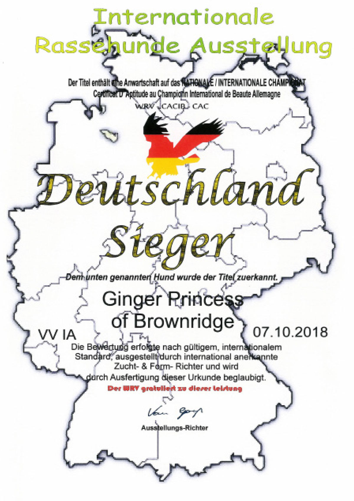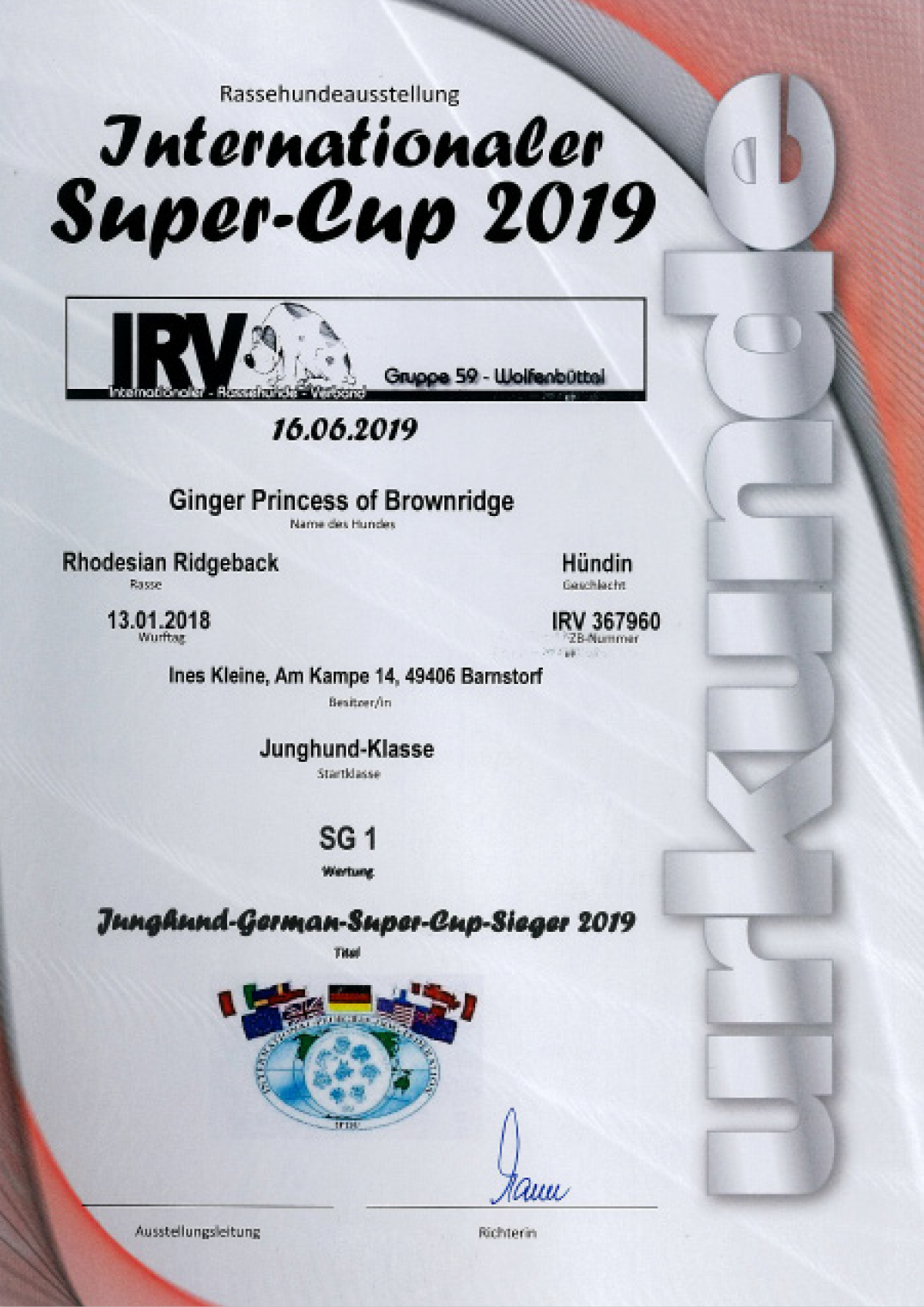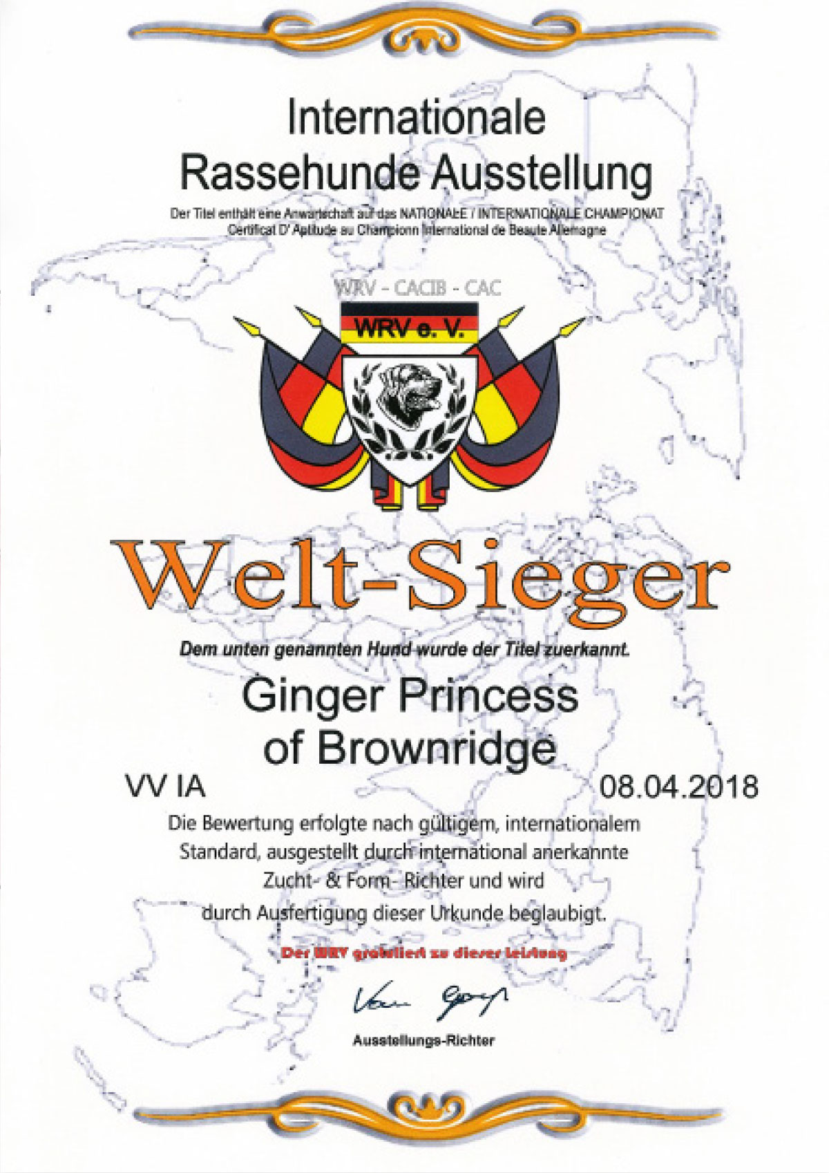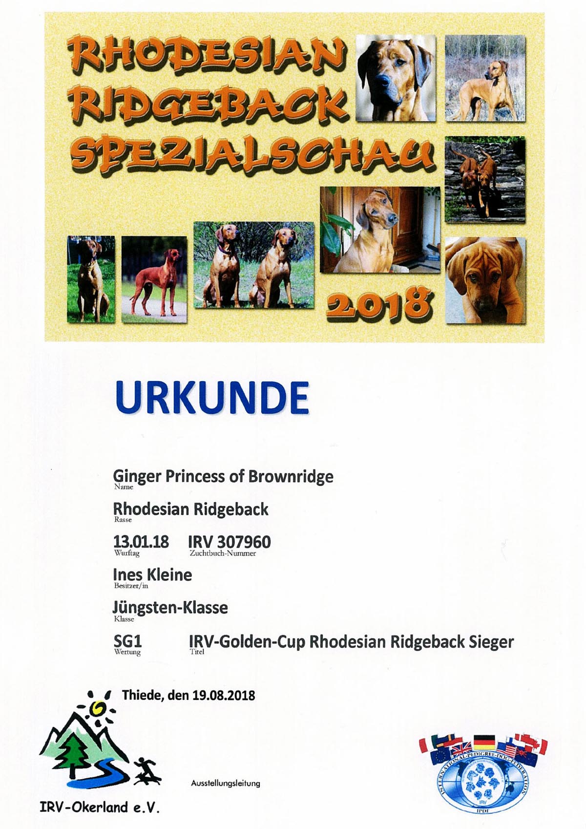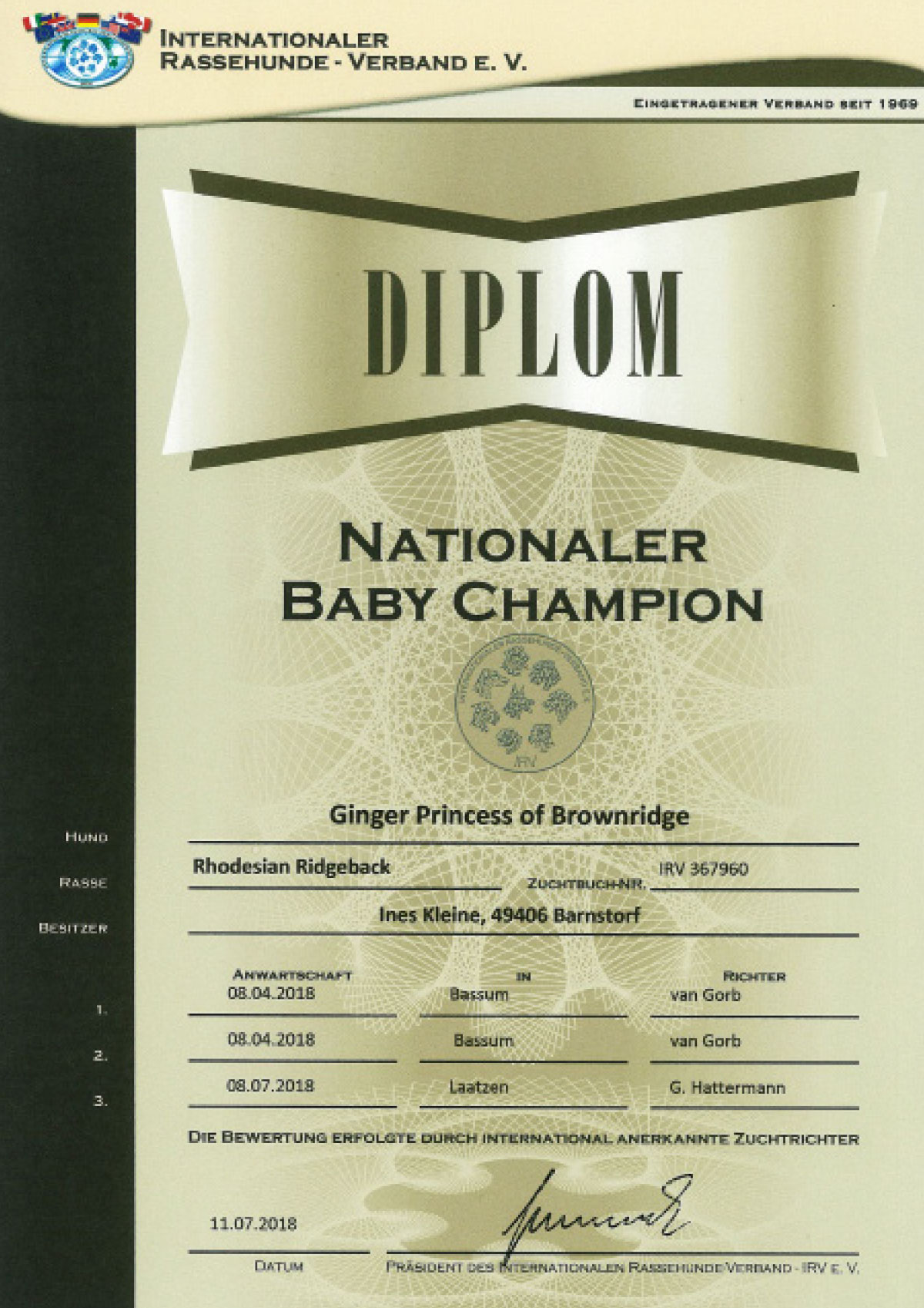 Ginger ist umfangreich genetisch und röntgenologisch getestet. In der Internationalen Gesundheits Datenbank bei Ridgeback International sind weltweit über 70.000 Rhodesian Ridgebacks mit ihren Gesundheitsprofilen gelistet und für Mitglieder frei einsehbar. Hier können Vorfahren bis nach Afrika verfolgt werden und es können Elternschaften dank DNA nachgewiesen werden.