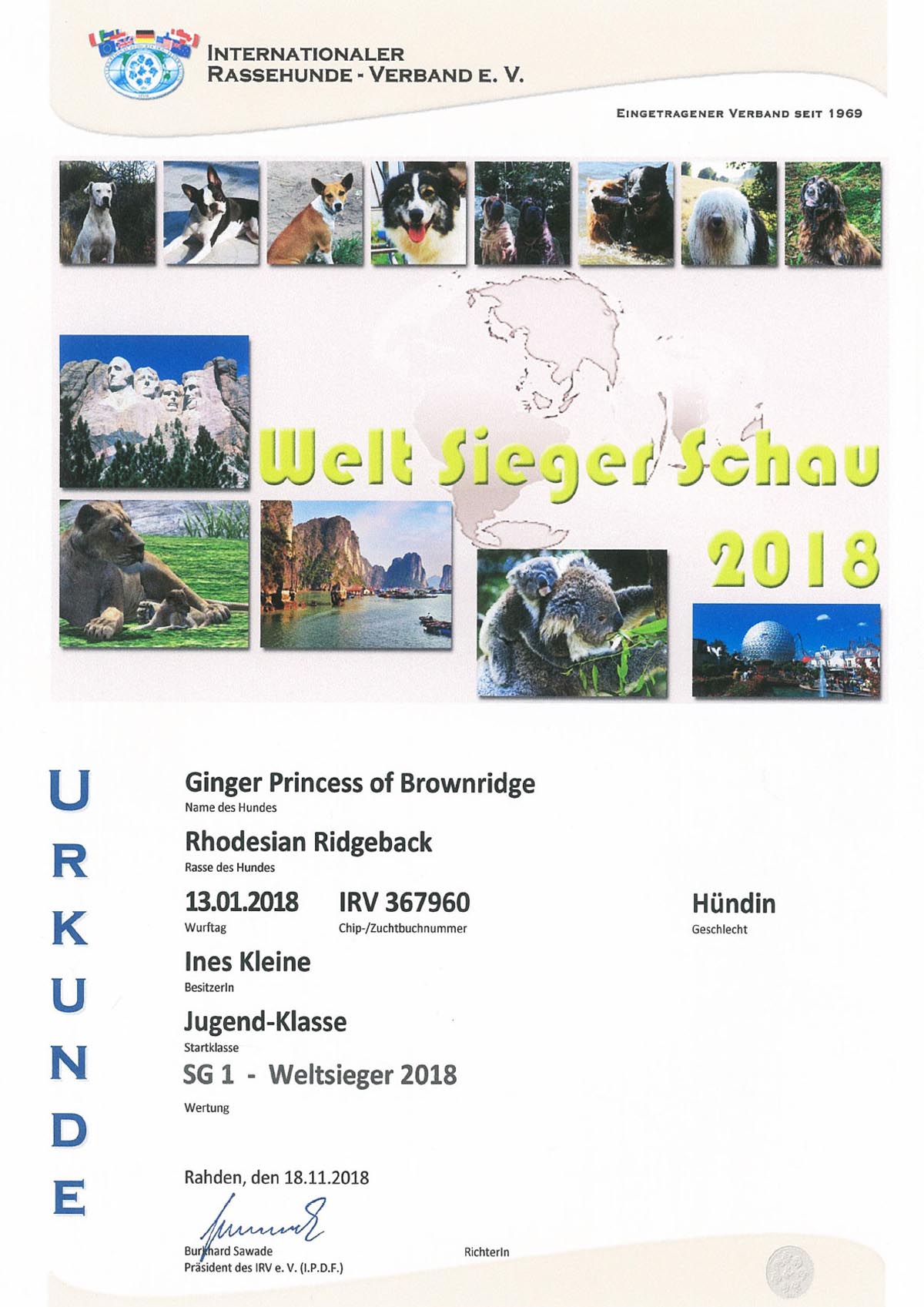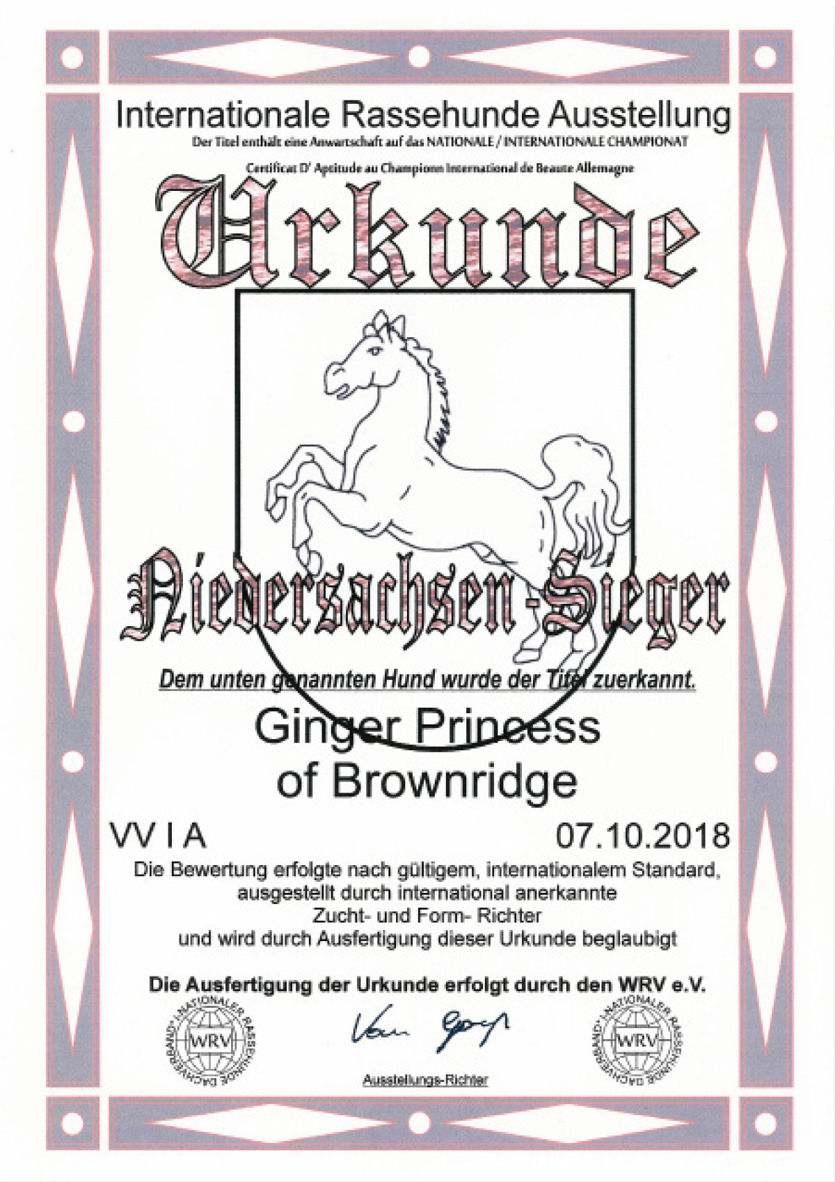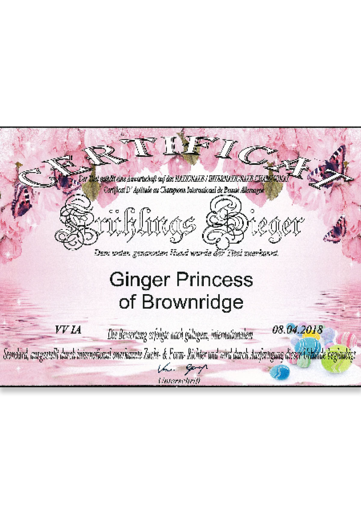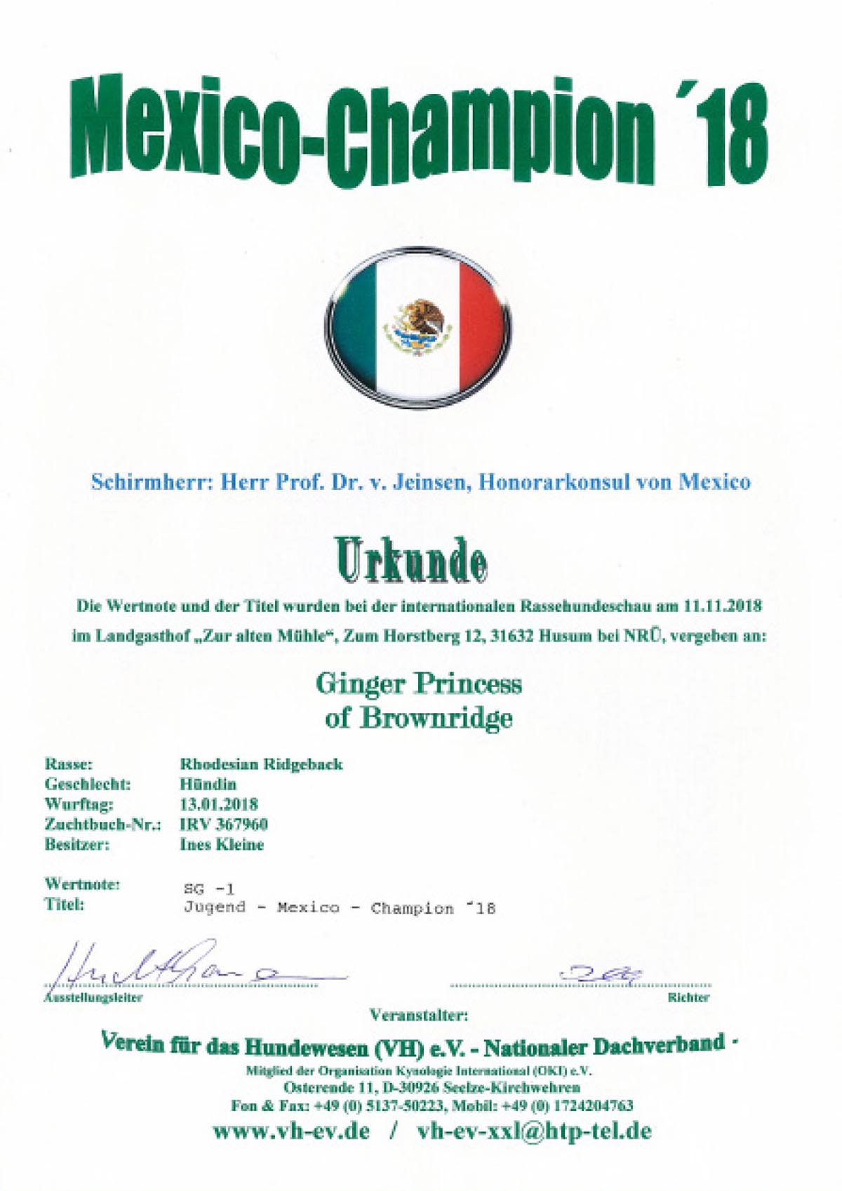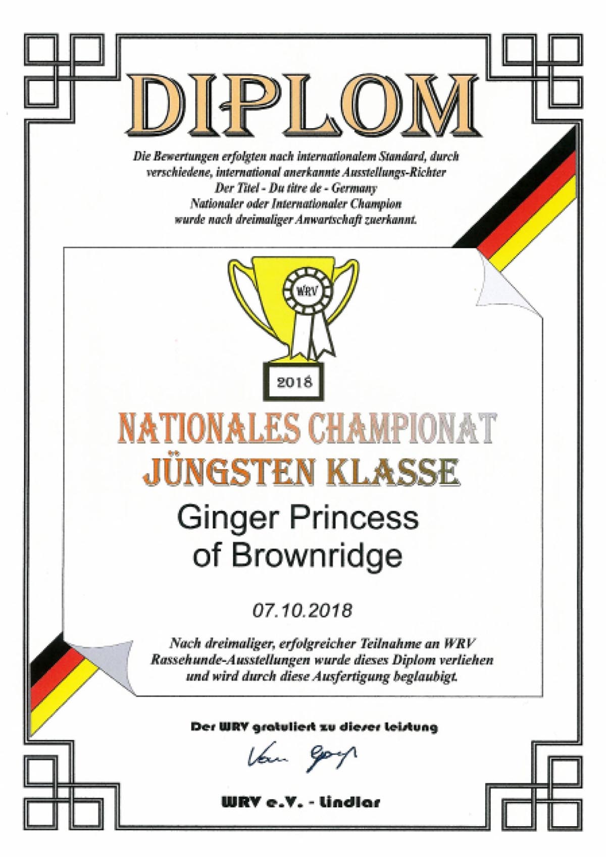 Ginger ist umfangreich genetisch und röntgenologisch getestet. In der Internationalen Gesundheits Datenbank bei Ridgeback International sind weltweit über 70.000 Rhodesian Ridgebacks mit ihren Gesundheitsprofilen gelistet und für Mitglieder frei einsehbar. Hier können Vorfahren bis nach Afrika verfolgt werden und es können Elternschaften dank DNA nachgewiesen werden.